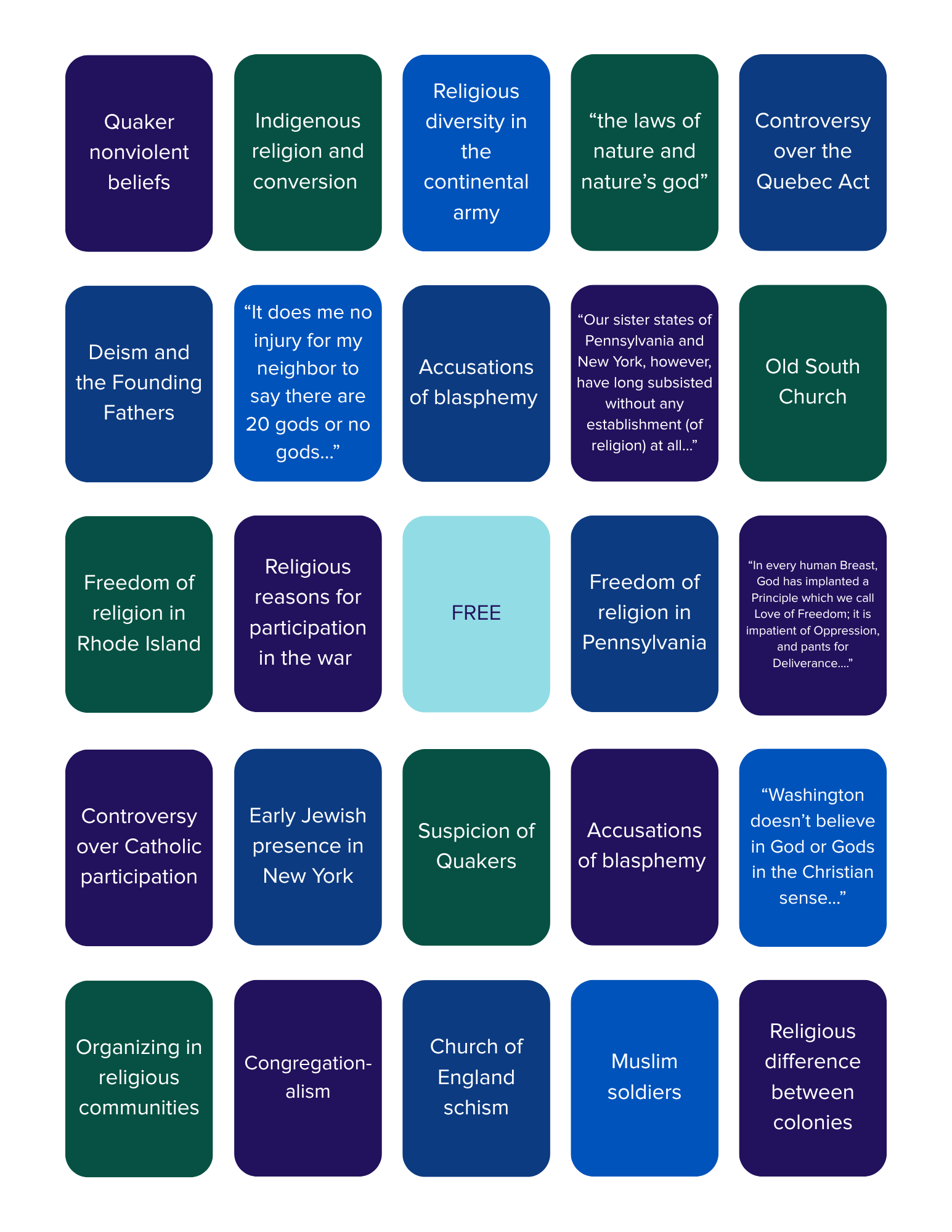 Ken Burns’ new film “The American Revolution” chronicles our country’s founding in six installments. Religious freedom is one of America’s founding ideals, and religious beliefs and conflicts play a role at numerous points in the film. The ways in which people’s faith and ideals of freedom and tolerance intersect with the war are complex and interesting. As you enjoy the documentary, here’s a bingo card of faith and freedom focused tidbits to look out for:
